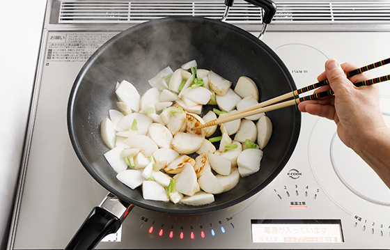 かぶを炒めるときは、実とつけ根を焼きつけてから葉を炒め合わせるのがポイントです。