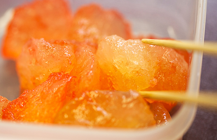 - アハハハハ。間違いなく大根の砂糖漬けですよ。まずすべての基本となる大根の砂糖漬けの作り方ですが、切って下ゆでした大根をザルに上げて水気を切り、かぶるくらいのレモン汁に2~3日漬ける。漬かった大根は崩れやすいので、ていねいにザルにとって水分を切る。あとは、1枚ずつまんべんなく上白糖をまぶして2~3日置いて、水分を箸でぬぐう。その後、再び1枚ずつ上白糖をまぶす……というふうに、砂糖に漬ける作業を合計4回繰り返せば、できあがりです。