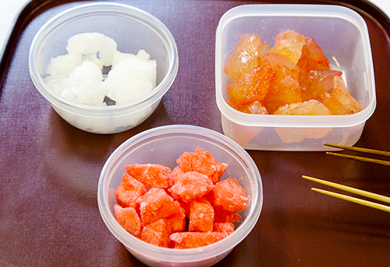 - いずれも味は和菓子そのものですね。かかる手間も「茜」などの「砂糖漬け」で1週間~10日、「大根糖」の「流水」でも3日くらいと本格的です。