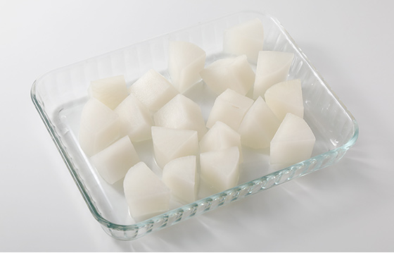 生の大根を料理に合わせて切り分け、6~24時間ほど冷凍し、自然解凍して使います。