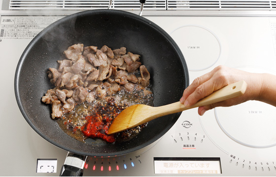 中華鍋を【予熱モード190℃】で熱し、【火力6】にしてサラダ油大さじ1を熱し、豚肉を加えて薄く焦げ目がつくまで炒め、片寄せる。
