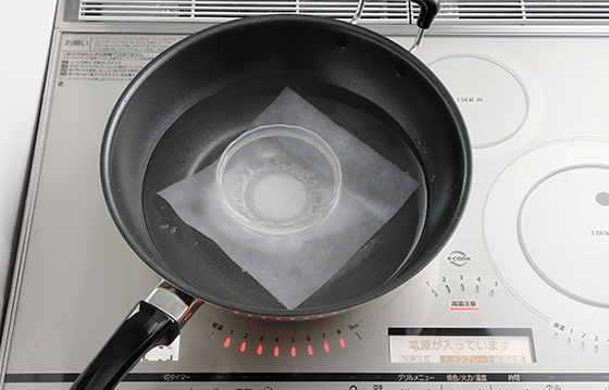 中華鍋にキッチンペーパーを敷いて高さ約4cmの耐熱容器を置き、水6~7カップを注ぎ、【火力8】でしっかり沸かす。