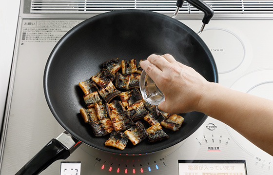 作り方のポイントは、洗った蒲焼きの皮を香ばしく炒め、