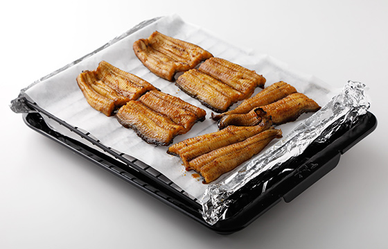 皮を下にして鰻を並べ、グリル【火力5】で5分焼き、たれを塗って3分焼く。