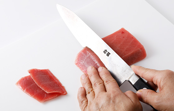 マグロはキッチンペーパーで水気をふき、包丁を寝かせて6~7mm厚さの幅広いそぎ切りにする。