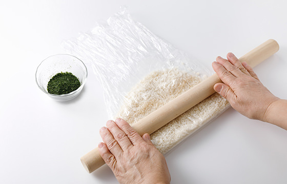 パン粉はポリ袋に入れて麺棒などで押して細かくし、青のりを加え混ぜてバットに移す。