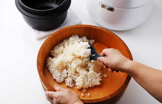 酢水でしぼった布巾で盤台をふき、炊き上がったご飯を一度に移す。