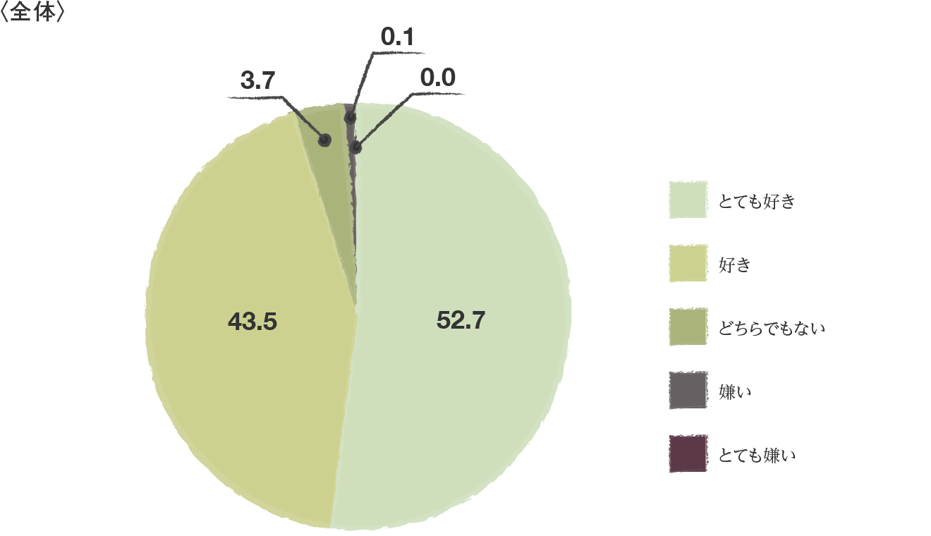 ライフスタイルの変化とともに、私たちの食事も和洋中と多様化してきましたが、「和食が好き」という人はどれくらいいらっしゃるのでしょうか?アンケートでは、和食を食べるのが「とても好き」「好き」を合わせると、96%の人が好きと答えています。たとえ時代が変化しても、和食の魅力は変わらないのですね。和食企画を過去に連載してきたCLUB MITSUBISHI ELECTRICとしてはとてもうれしい結果です。