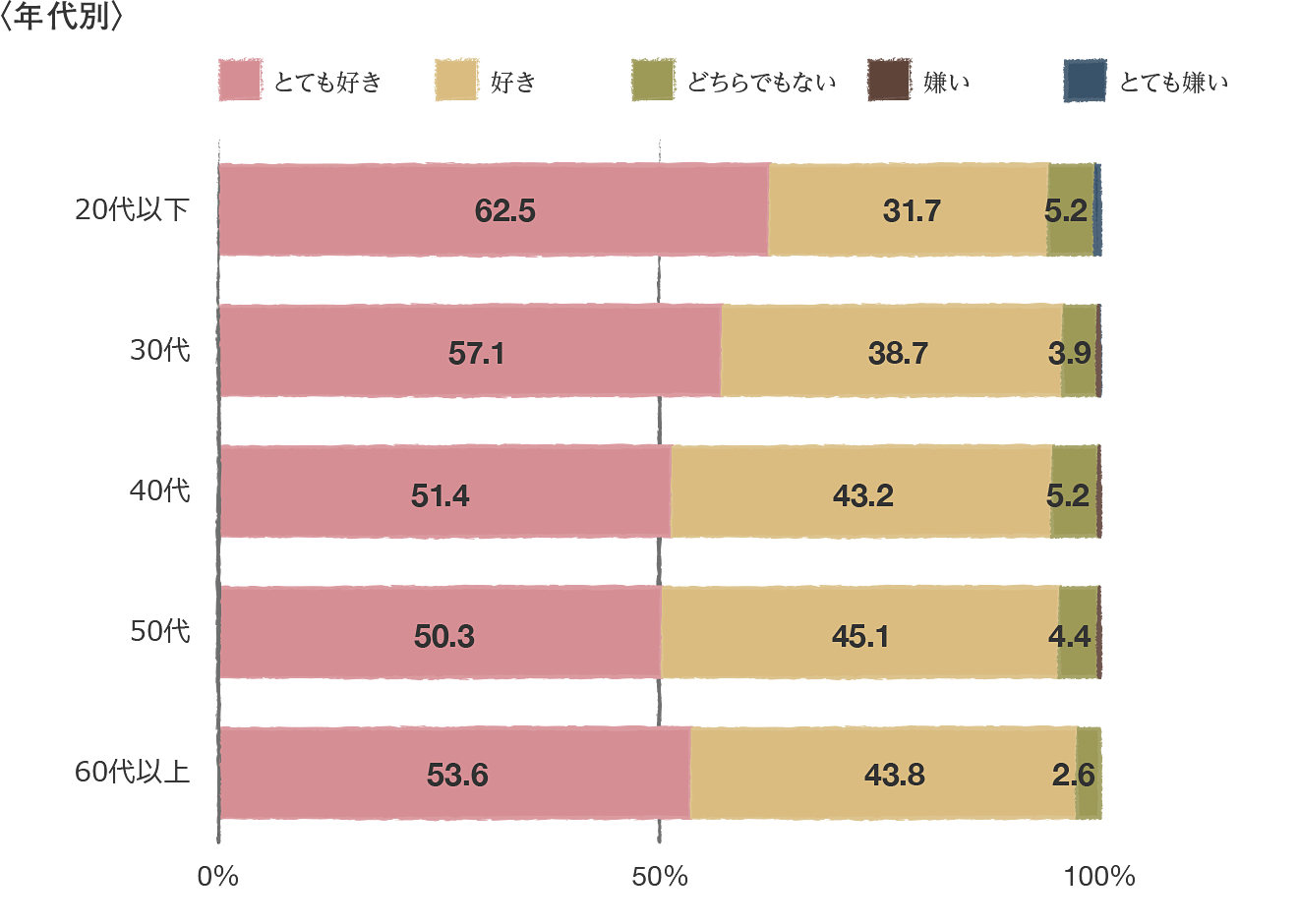上の結果を年代別に見ると、30代以下では「とても好き」「好き」を合わせると、5割以上が和食を作るのが好きなことがわかりました。意外にも和食好きが多い60代以上の世代よりも多い結果に。子育て世代を含む若い人たちの間では、和食を作ることへの関心が高まっているんですね。