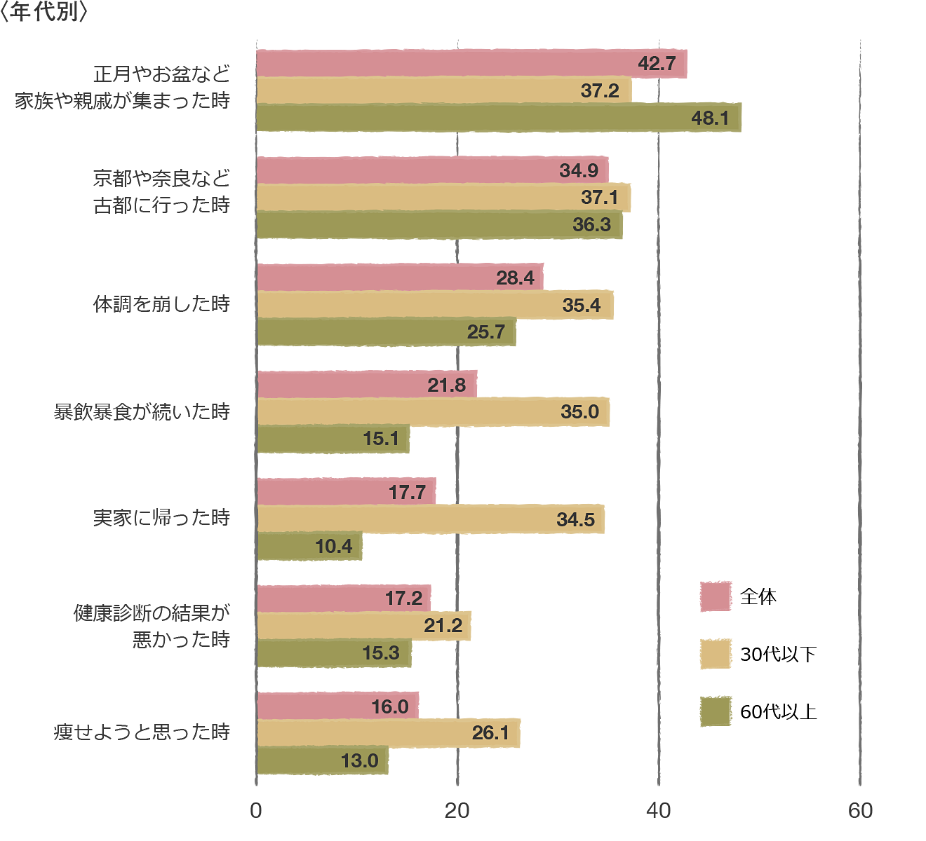30代以下では、他の世代に比べて「暴飲暴食が続いた時」(34.9%)や、「体調を崩した時」(32.7%)との回答が多く、和食は健康的な食事だと考えている人が多いようですね。