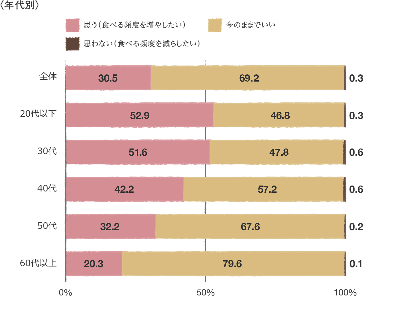 前述のアンケートに反比例して、若い人ほど「もっと和食を食べたい」と思う人が増えています。とくに20代、30代では半数以上が「今よりもっと和食を食べたい」と回答していますが、20代では前述のアンケートで「ほぼ毎日」食べている人をのぞいた66.7%のうち、約8割が本当はもっと食べたいと思っていることになります。一方、すでにほぼ毎日食べている人が半数以上いる60代以上では、今のままでいいと思っているようです。