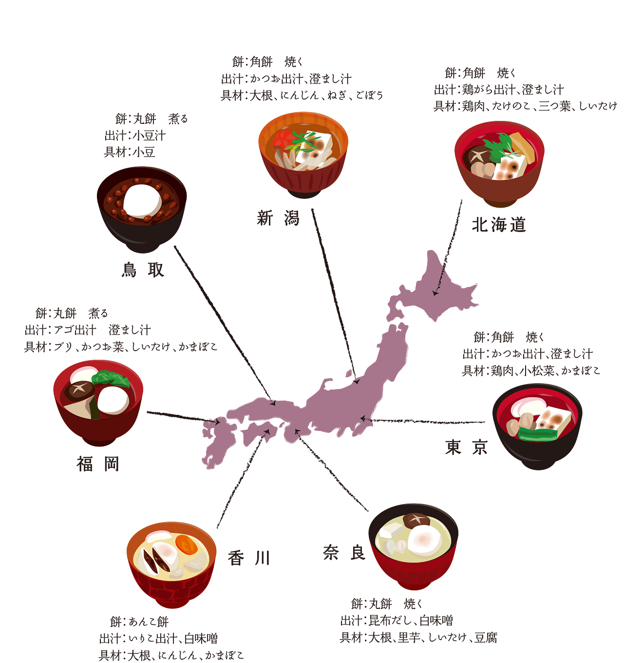 皆さんはどんなお雑煮を食べていますか?お雑煮には、全国各地の風土が反映されているもの。そこで北海道から九州まで、全国から寄せられたお雑煮の特徴をマップとイラストでご紹介します。