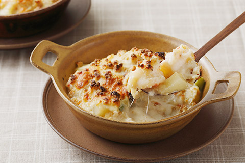 すっきり味の信州みそと、まったり味の白甘みそを合わせてホワイトソース系のソースを作り、和洋折衷のグラタンにしました。牛乳のにおいが苦手な方でも、みそのマスキング効果(臭み成分を包み込む効果)でおいしく食べられます。