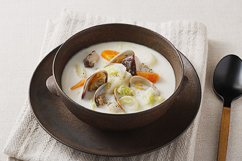 洋風のミルクスープを和風の野菜としょうゆの香りで和食に仕立てました。