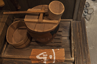 - それぞれの家が井戸から汲んできた水を各戸の水瓶に溜めておいて、煮炊きなどに使っていました。あとは土間から室内に上がるとき、手足をふくのにも使います。大正時代には洋靴もずいぶんと一般的になってきていましたが、草履や下駄などを履く家もまだ多く、部屋に上がるときの作法も現代とは少し違っていたのです。