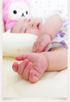 iPhoneで撮影した赤ちゃんの写真。アングルを寝ている子どもの目線まで下げて、手のアップで可愛さを表現。ボカシ加工やトイカメラ風のエフェクトなど、スマートフォンでできることも意外と多い。