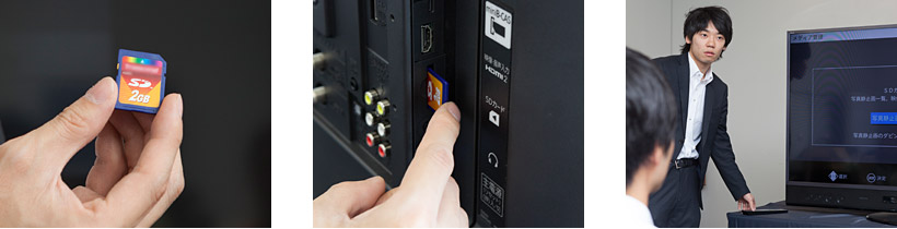 - はい。まず、三菱液晶テレビLSR7シリーズには「SDカード静止画再生機能」があるんです。再生の方法は簡単。JPEG形式の画像の入ったSDカード※1をテレビ側面のスロットに差し込むだけで、専用メニューが立ち上がります。あとは画面と音声の指示に従うだけで、見たい写真をいつでも高画質な液晶の大画面で楽しめますよ。