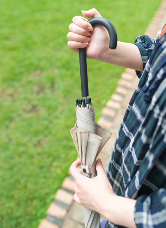 傘をさすときは、体の中心でまっすぐ持つようにしましょう。その際、柄の曲がっている側を自分の体側に向けて持つと、バランスが取りやすくなります。