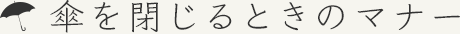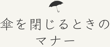 周囲を確認し、傘をさした状態のまま上で少しすぼめてからゆっくり斜め下に下ろして、完全に閉じるようにしましょう。その後は水滴の飛び散りなどを防ぐため、しっかりバンドで傘を巻いてください。