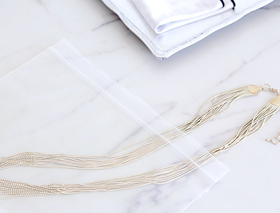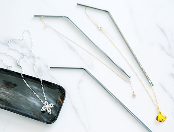 チェーンなどが細くて絡みやすいものは、ストローに切り込みを入れて保管をすると絡まなくて、使う時にさっと取り出すことができて便利。