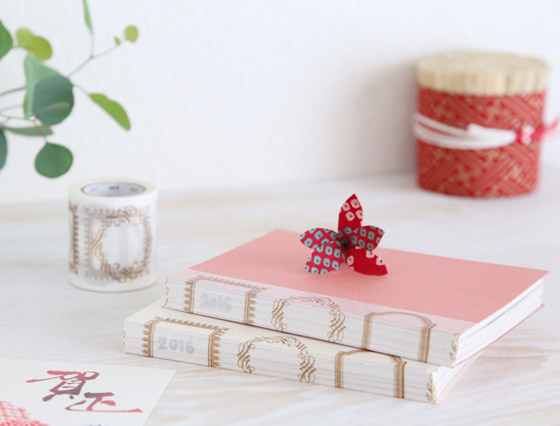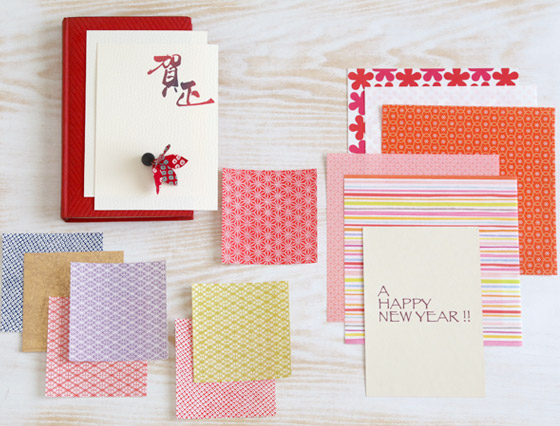 ポイントとしては、お正月らしい「赤や金、和風古典的な絵柄」を選ぶこと。千代紙や和紙は、ハサミを使わずにちぎってみると、味わいが出ます。