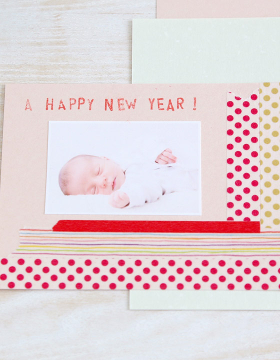 手に入りやすい折り紙や千代紙、和紙などを適当な大きさに切ったり、ちぎったりして、はがきに貼るだけで、手づくり感が伝わりあたたかみのある年賀状に…。