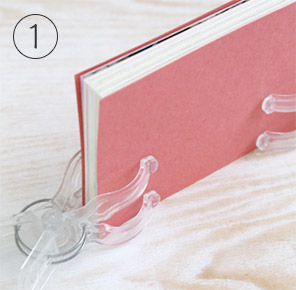 背表紙側が平らになるように揃えて、大き目のクリップで固定します。