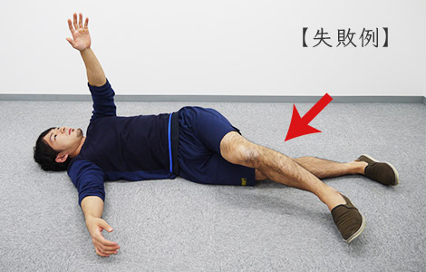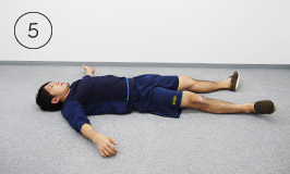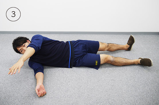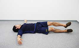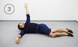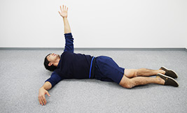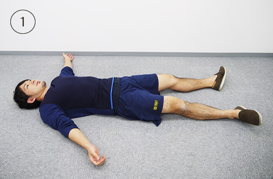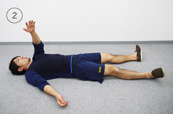 仰向けになって四肢の力を抜いたら、左腕を横に伸ばします。