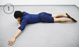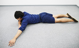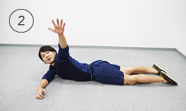 次はうつぶせの状態から最初の仰向けの状態に戻ります。脚の力を使わないように注意しましょう。これで一往復です。反対側も、同じようにやってみましょう。1回の運動のめやすは1方向3往復、または左右1分間ずつ行います。(回数は問いません)