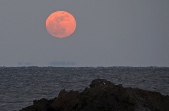 赤い満月を見るには昇りたてがチャンス。海辺なら水平線から昇る満月、都会ならビルの谷間からネオンと間違えるような赤い満月を秋にも見ることができるでしょう。