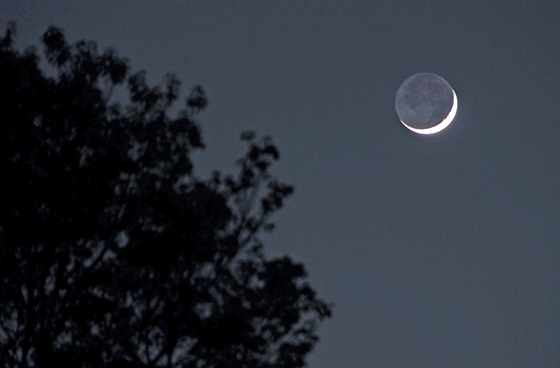三日月をよく見ると、影の部分がうっすら丸く見えるときがあります。これを地球照(ちきゅうしょう)、あるいはアースシャインといいます。