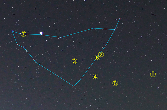 写真はやぎ座で、数字はやぎ座を移動する最接近前後の火星の位置。