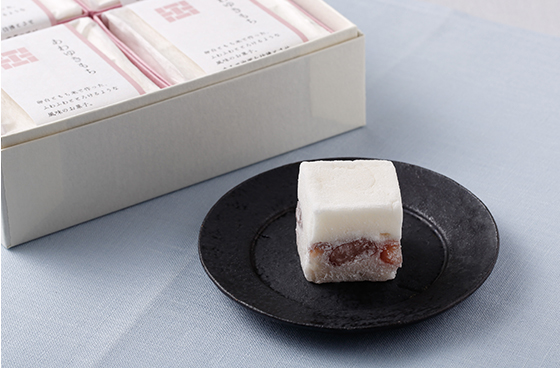 幸せを形にすると、このお菓子になる!マシュマロとお餅の中間のような食感が、とても心地いいんです。大粒の煮豆が入っていて、意外に食べごたえがあります。