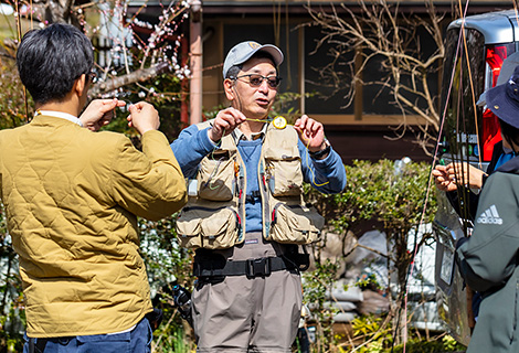 ここで、今回ご指導いただくフィッシングスクールの石崎さんと合流。まずはお借りした釣り竿(タックル)のセッティングに取りかかります。特に丁寧にご指導いただいたのが、釣り糸(ライン)の結び方。フライフィッシングでは釣り糸を木の枝に引っかけたり、岩場に挟んだりすることが多いため、1日に何度も結び直します。釣り糸に仕掛けるのは、毛ばり(フライ)と呼ばれる小さな疑似餌。魚の食性を利用し、ふだん食べている虫に見せかけて釣るのがフライフィッシングの特長だそうです。