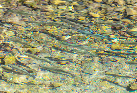 最初に訪れたのは、練習エリア。川の流れが緩やかになるよう造成された区画で、初心者の練習にもぴったりです。透き通った川底には太陽の光にきらめく魚の群れが! 高まる期待を胸に、さっそく「キャスティング」と呼ばれるフライの投げ入れ方を練習します。