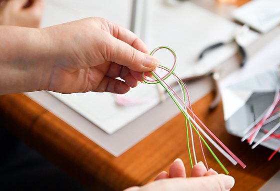 続いて、はじめての水引づくりにふさわしい「あわび結び」に挑戦。通常、水引は吉数である1本、3本、5本、7本を使うのですが、末広がりを表す8本や、10本を使って豪華な飾りを作る場合もあります。初心者の編集部員は、扱いやすい2本でチャレンジ。組み合わせる水引の色合いで表情が異なるため「どの色にしようかな?」と、ついつい色選びに夢中になってしまいます。