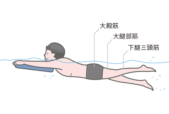 ブランクがある方や初心者の方は、まずビート板を用いたバタ足(板キック)ができるようになることを目標にするといいでしょう。バタ足は、脚の甲をバレリーナのように伸ばし、太ももに力を入れて脚全体で水を打つように動かす動作です。このとき、顔は水面上に上げたままでも、水につけても構いません。運動効果が見込めるのは、大殿筋(おしり)、大腿部筋(太もも)、下腿三頭筋(ふくらはぎ)などの筋肉。太ももの大きな筋肉を鍛えることによって、基礎代謝が高まりやすくなります。