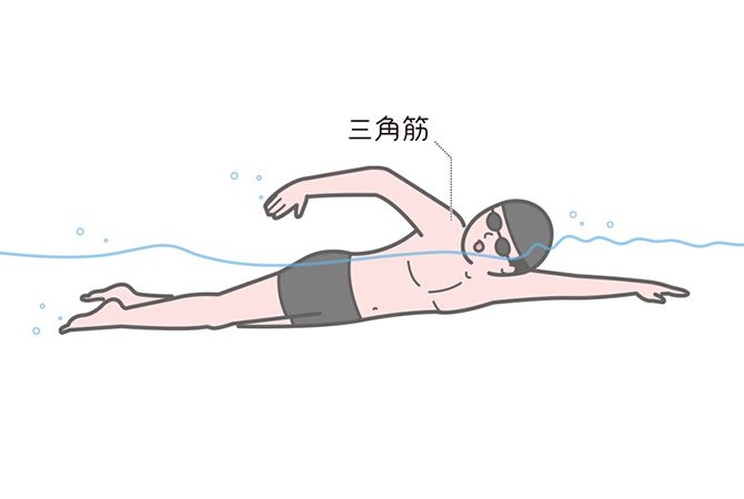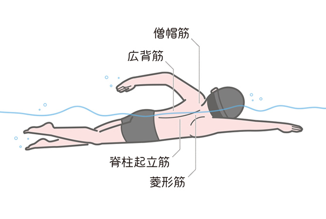 クロールは、下半身だけでなく上半身も大きく動かす泳ぎ方。バタ足に比べてエネルギーの消費量が多いのが特徴です。肩から腕を回すことから、菱形筋、僧帽筋、三角筋といった肩甲骨回りの筋肉がほぐれます。広背筋や脊柱起立筋といった背中の筋肉の鍛える効果も。肩こりや腰痛に悩む方にもおすすめです。全身を使うことから、バタ足よりも効率的な基礎代謝アップが期待できます。