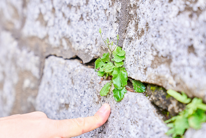 散歩する場所によって、目にすることのできる草花の種類は異なります。この違いを知ると、楽しみはいっそう深まるはずです。公園や遊歩道で楽しめるのは、パンジーやマリーゴールドをはじめとする華やかな花々。一方で、古くからある社寺などの林にはカシやコナラといったもともとの自然が感じられる樹木が立ち並んでいます。普段の生活では見落としがちですが、住宅地も面白い発見の宝庫です。民家の石塀の隙間から芽が出ていたり、庭の園芸植物の種が風で運ばれ、道ばたで花開いていることも。「この植物はどこからやってきたのだろう」と想像するのも楽しいものです。交通量が比較的多い市街地は、植物にとってタフな環境。排気ガスや乾燥に強い草花が多く見られます。オーストラリア原産のリューカデンドロンやウエストリンギアといった植物はその代表例です。日当たりのいい場所は強い植物が大きく育つ一方で、苔やどくだみといった多様な植物が共生しているのは路地裏や北向きの斜面。このように、草花は自己に適した環境で根付いています。