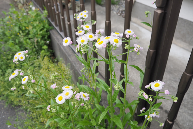 糸のように細い花びら(舌状花)を無数にまとったハルジオン。やわらかく繊細な姿をしていますが、都市部の道端でもたくましく育ちます。形が似ていて見間違いやすいのがヒメジョオン。茎が硬く、つぼみが天に向かって伸びているヒメジョオンに対して、ハルジオンの茎は柔らかく、つぼみの状態だとうつむいているのが特徴です。