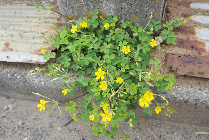 市街地の敷石の間などでよく見かけるのがカタバミ。環境によって葉の色が変化するのが大きな特徴です。土から生える場合は緑色に、都市部の道路の隙間などでは赤みがかった色になることが多いようです。コンクリートの隙間や植木鉢の中、庭などあらゆる場所に生えている植物です。