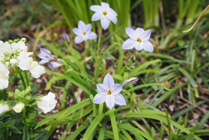 星のようなかわいらしい形と、透き通るような淡紫色が特徴のハナニラ。アルゼンチンが原産で、日本に定着しました。道ばたや民家の庭、土手などさまざまな場所に咲いています。ニラのような香りがすることがこの名の由来ですが、葉には毒があるので注意が必要です。