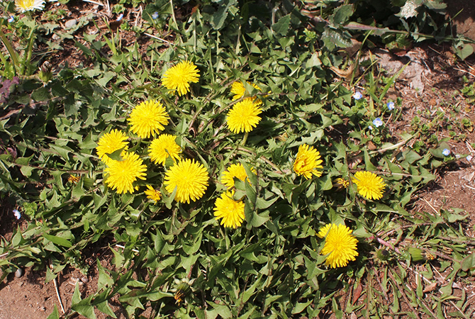 春の花の代表格であるタンポポ。街中で咲いているのは、ヨーロッパ原産のセイヨウタンポポやその雑種がほとんどです。葉が地面を這うように出ているため、背の高い植物に日光を遮られると負けてしまいます。競争相手の少ない田畑や路地裏などに多く生えています。