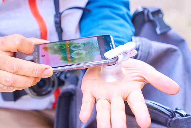 拡大して草花をつぶさに観察するのに適したルーペ。ポイントは、スマートフォンのカメラレンズに取り付けられるクリップがついていることです。植物を手のひらに乗せ、ルーペをかぶせてスマートフォンのディスプレイ上で観察しましょう。そのまま撮影すれば出会いを記録できる優れものです。