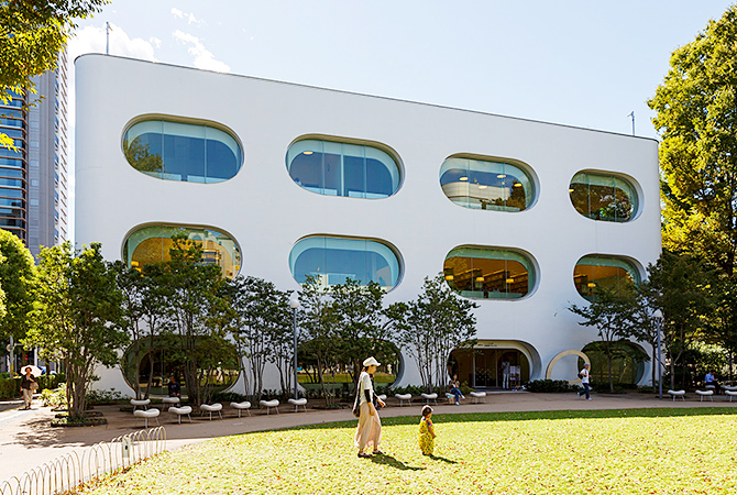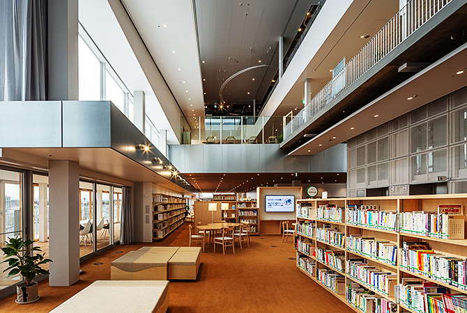 円形の窓が並んだ個性的な外観に、「ルーム」と呼ばれる丸みを帯びた部屋が連なった内観。やわらかい曲線的なデザインが印象的です。ここは図書館をはじめ生涯学習支援、市民活動支援、青少年活動支援の4つの機能を備えた複合機能施設です。併設されたカフェでは食事やティータイムを楽しむ人々が集い、青少年専用のスペース「ティーンズスタジオ」では勉強だけでなくバンドやダンスの練習に勤しむ若者たちの姿も。すべての世代にとって過ごしやすい場所になっています。