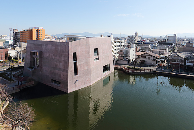 初めて訪れた方は、池の一角に浮かぶように建った重厚な外観に目を見張るはず。古墳が多く現存する松原市の地域性にちなんで作られました。外観は巨大な岩のようですが、館内には吹き抜けがあり、各階がゆるやかにつながるスキップフロアによって想像以上に明るく広々とした空間になっています。この独創的なデザインが高く評価され、2020年にはグッドデザイン賞を受賞しました。