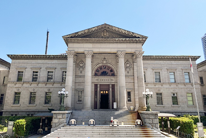 住友家第15代当主の寄付により、1904年に開館しました。ギリシャ神殿の建築様式が取り入れられており、コリント式の大きな柱を擁する外観が印象的です。内部はバロック様式を基調とした格調高いデザインに。中央のホールにはステンドグラスから自然光が差し込み、神聖な雰囲気を醸しています。本館と左右の両翼は、1974年に国の重要文化財に指定されました。戦災を逃れて今なお使われ続ける、歴史的な価値の高い図書館です。