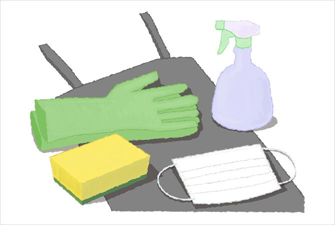 掃除の際には汚れてもいい服を身に着け、袖は下がってこないように輪ゴムで留めておきます。掃除中にはホコリが舞うためマスクを着用し、ゴム手袋で手荒れの防止を。窓を開けて換気をよくしておくことも忘れずに。