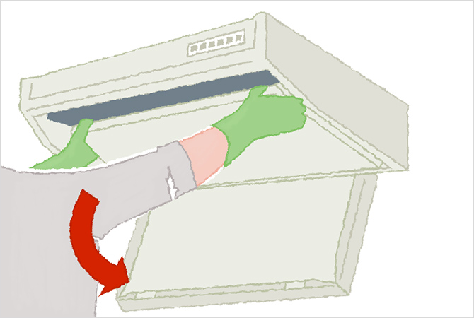 掃除中に落ちてくるホコリがコンロに入り込まないように、換気扇の下には新聞紙を敷きます。換気扇のスイッチはオフにして、ファンの回転が完全に止まっていることを確認したら、換気扇のフィルターや天板など取り外しが可能なパーツはすべて外しましょう。