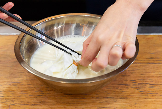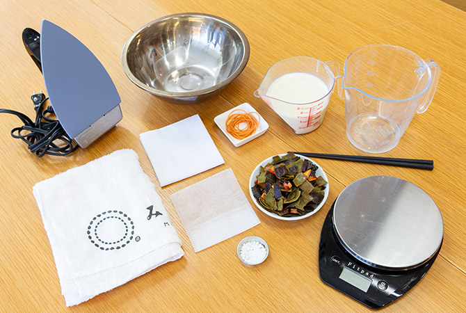 豆乳と水を1 :1 の割合で混ぜましょう。量はハンカチが浸かる程度に、温度は常温で問題ありません。ハンカチを入れ、時折ひっくり返しながらよく揉みこみます。布が重なっている部分は箸でつまんでていねいに開きながら、全体に液を浸透させましょう。20分浸したら固く絞り、タオルなどで水気をとって乾燥させます。